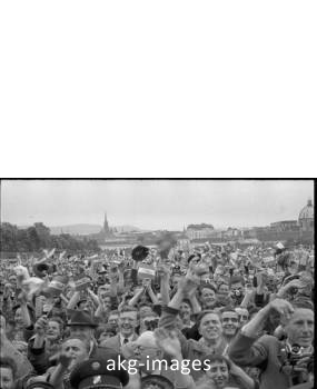 Jubilant crowds outside the Belvedere Palace in Vienna celebrate