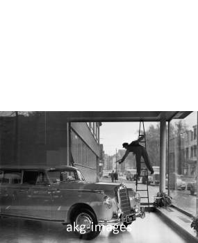 latest Mercedes in a salesroom; a window-cleaner at work. Dusseldorf,