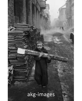 small boy carries a huge piece of firewood. Budapest, December 1956