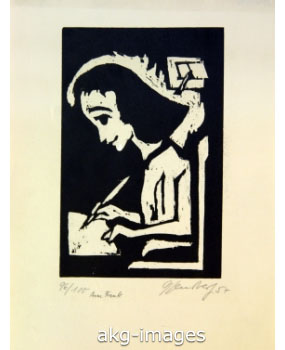 7-D1-0000C13F 1957 woodcut illustration of Anne Frank by Herbert Sandberg (artist's copyright through akg-images)