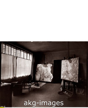 2-1-K840-M1-1918-1 Klimt's final studio in Vienna, with two painting unfinished at his death, Woman with Fan and The Bride, 1918
