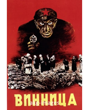 A Nazi propaganda poster shows a Jewish commissar above the victims